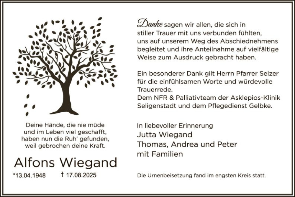 Hier finden Sie alle Traueranzeigen aus der Zeitung, die bisher für Alfons Wiegand erschienen sind. Weitere Traueranzeigen, die in der Zeitung erscheinen, werden hier ebenfalls aufgelistet