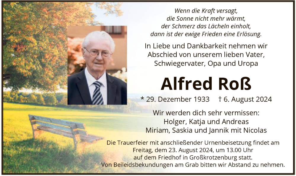 Hier finden Sie alle Traueranzeigen aus der Zeitung, die bisher für Alfred Roß erschienen sind. Weitere Traueranzeigen, die in der Zeitung erscheinen, werden hier ebenfalls aufgelistet