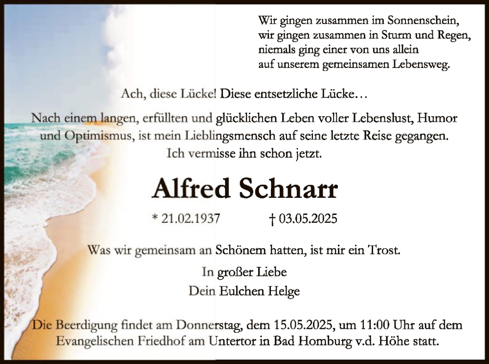 Hier finden Sie alle Traueranzeigen aus der Zeitung, die bisher für Alfred Schnarr erschienen sind. Weitere Traueranzeigen, die in der Zeitung erscheinen, werden hier ebenfalls aufgelistet