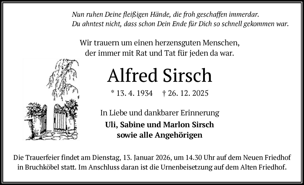 Hier finden Sie alle Traueranzeigen aus der Zeitung, die bisher für Alfred Sirsch erschienen sind. Weitere Traueranzeigen, die in der Zeitung erscheinen, werden hier ebenfalls aufgelistet