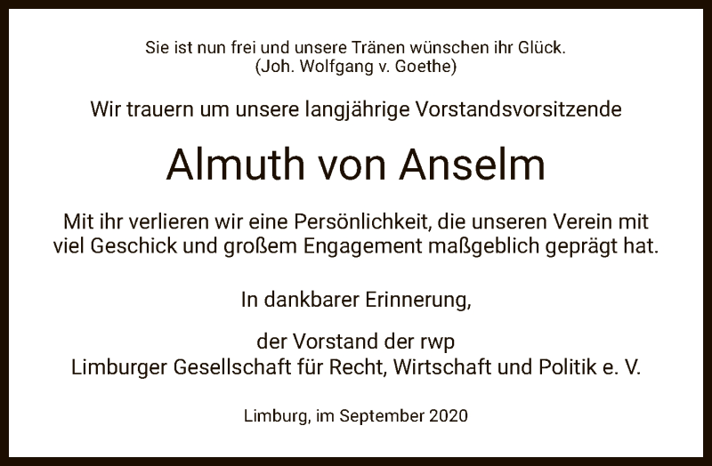 Hier finden Sie alle Traueranzeigen aus der Zeitung, die bisher für Almuth von Anselm erschienen sind. Weitere Traueranzeigen, die in der Zeitung erscheinen, werden hier ebenfalls aufgelistet