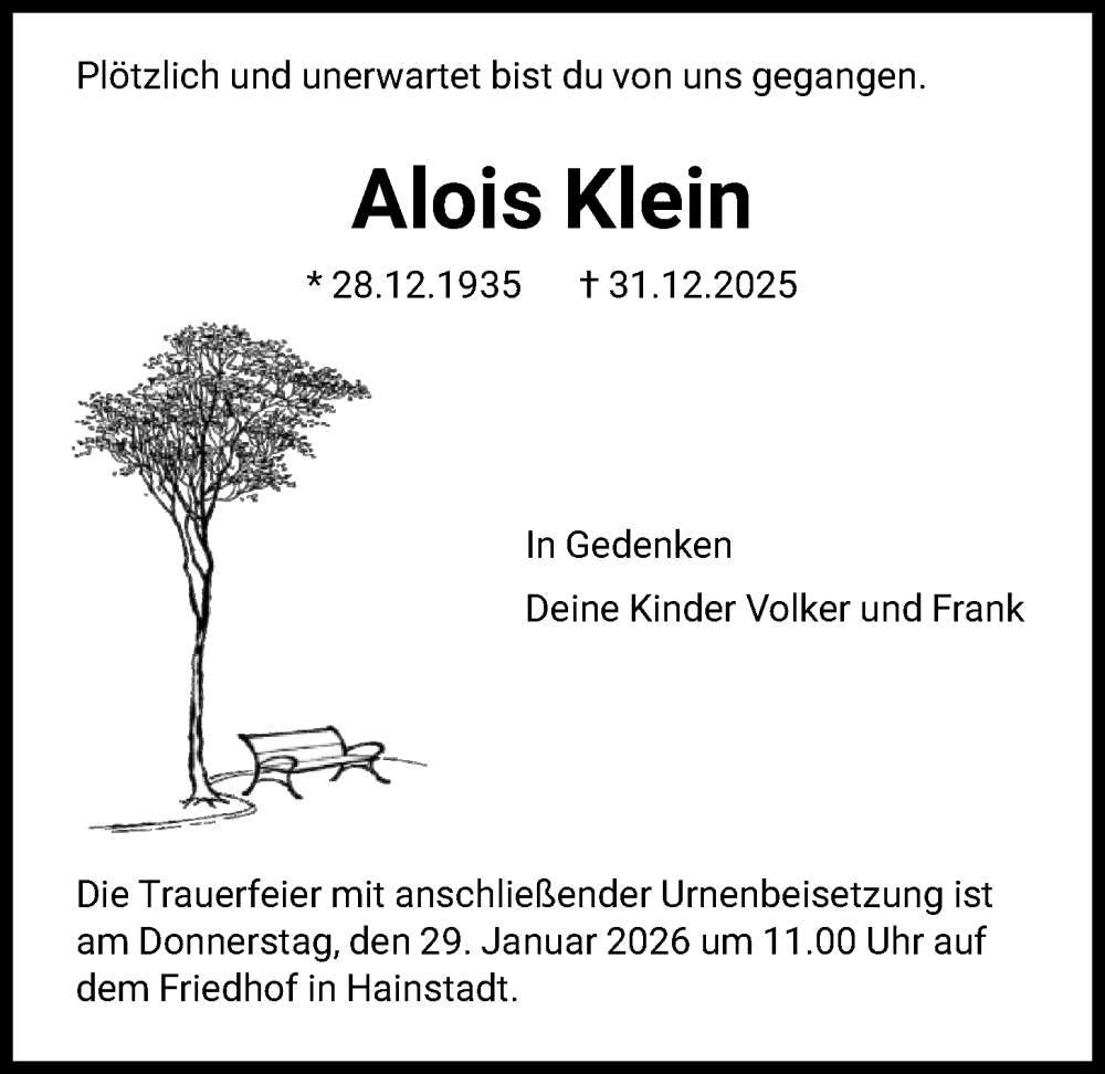Hier finden Sie alle Traueranzeigen aus der Zeitung, die bisher für Alois Klein erschienen sind. Weitere Traueranzeigen, die in der Zeitung erscheinen, werden hier ebenfalls aufgelistet