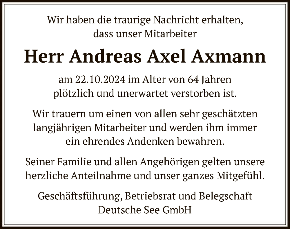 Hier finden Sie alle Traueranzeigen aus der Zeitung, die bisher für Andreas Axel Axmann erschienen sind. Weitere Traueranzeigen, die in der Zeitung erscheinen, werden hier ebenfalls aufgelistet