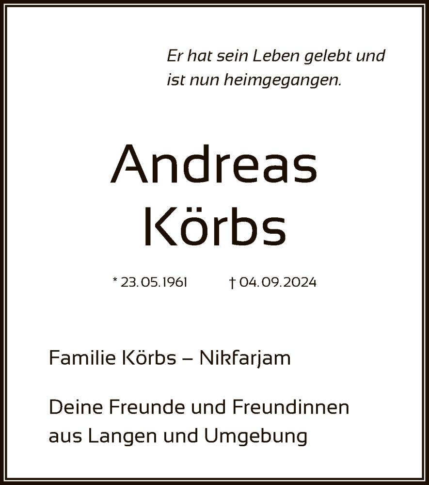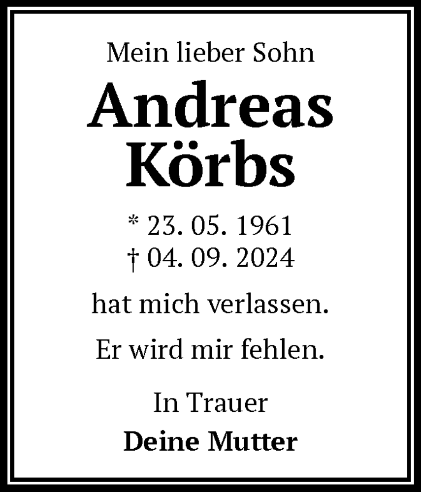 Hier finden Sie alle Traueranzeigen aus der Zeitung, die bisher für Andreas Körbs erschienen sind. Weitere Traueranzeigen, die in der Zeitung erscheinen, werden hier ebenfalls aufgelistet