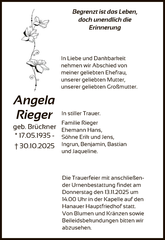 Hier finden Sie alle Traueranzeigen aus der Zeitung, die bisher für Angela Rieger erschienen sind. Weitere Traueranzeigen, die in der Zeitung erscheinen, werden hier ebenfalls aufgelistet