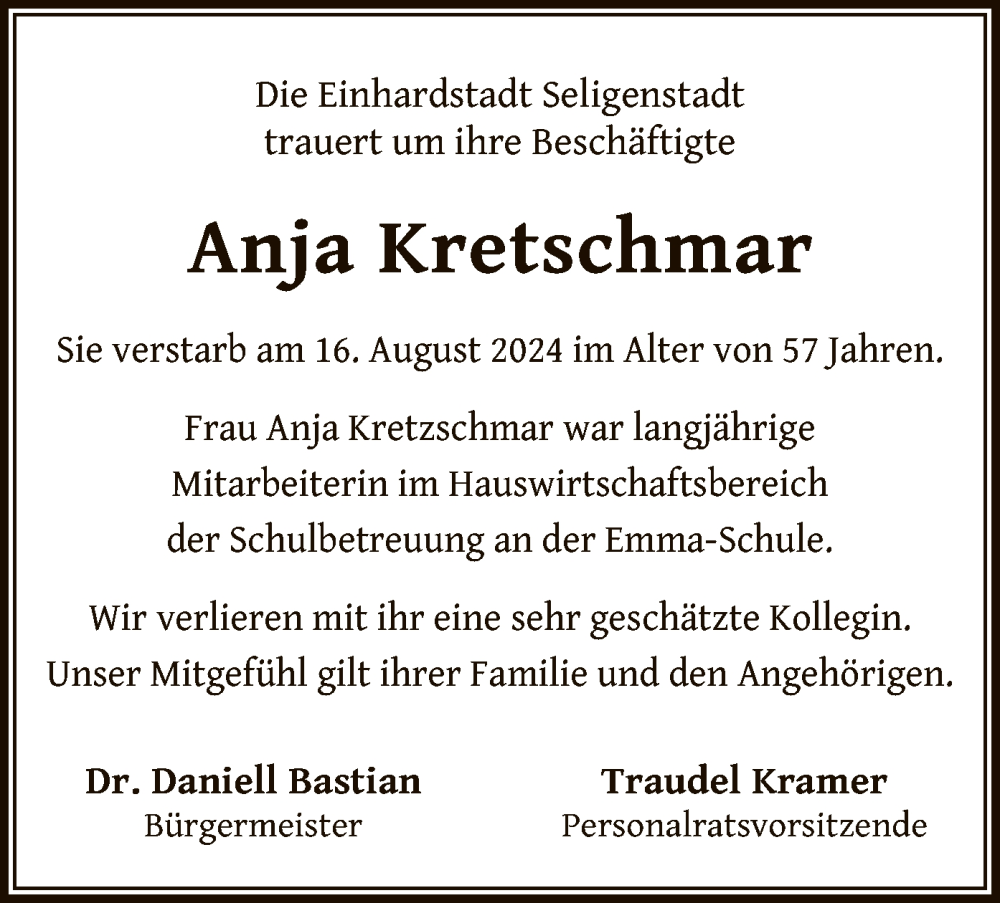 Hier finden Sie alle Traueranzeigen aus der Zeitung, die bisher für Anja Kretschmar erschienen sind. Weitere Traueranzeigen, die in der Zeitung erscheinen, werden hier ebenfalls aufgelistet