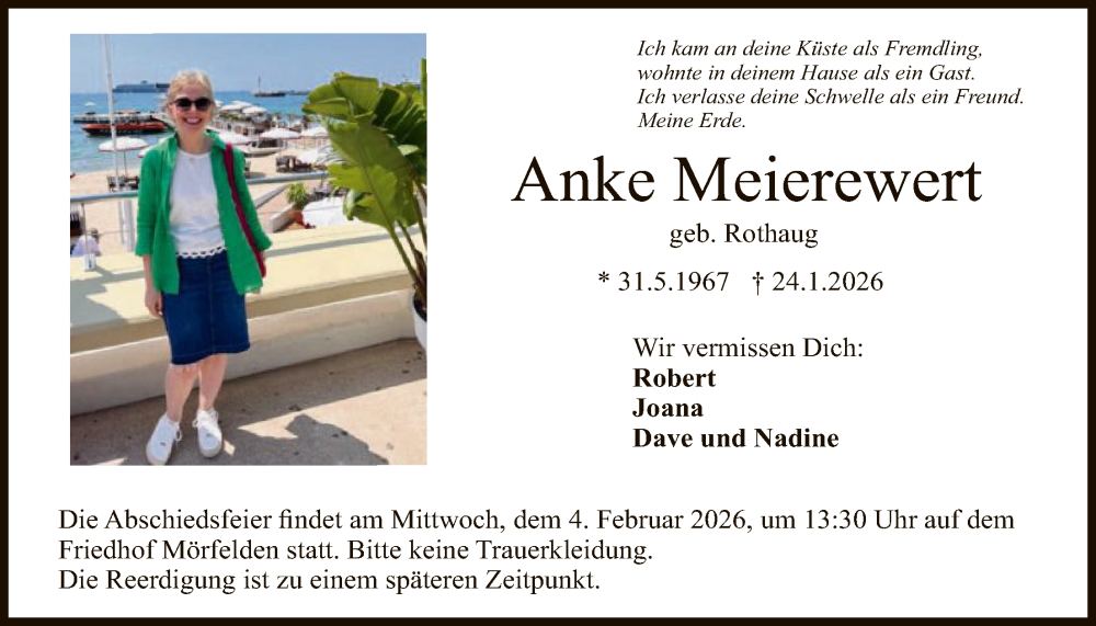 Hier finden Sie alle Traueranzeigen aus der Zeitung, die bisher für Anke Meierewert erschienen sind. Weitere Traueranzeigen, die in der Zeitung erscheinen, werden hier ebenfalls aufgelistet