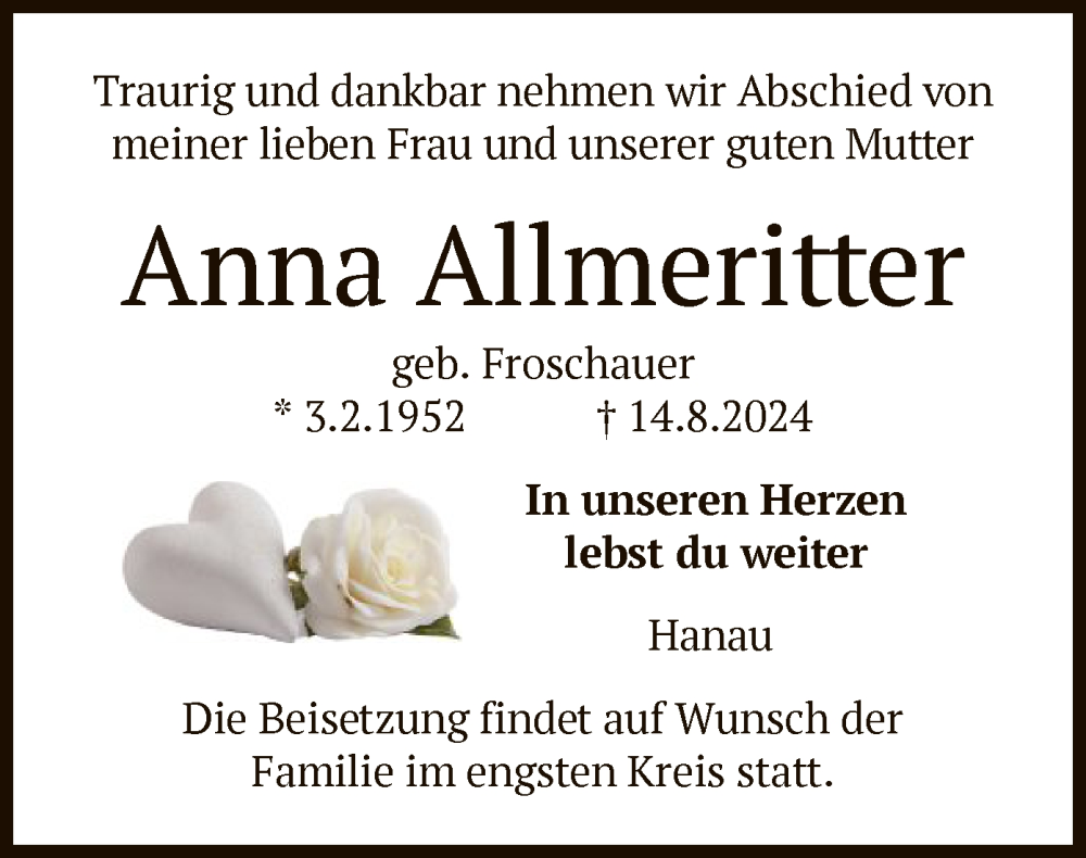 Hier finden Sie alle Traueranzeigen aus der Zeitung, die bisher für Anna Allmeritter erschienen sind. Weitere Traueranzeigen, die in der Zeitung erscheinen, werden hier ebenfalls aufgelistet