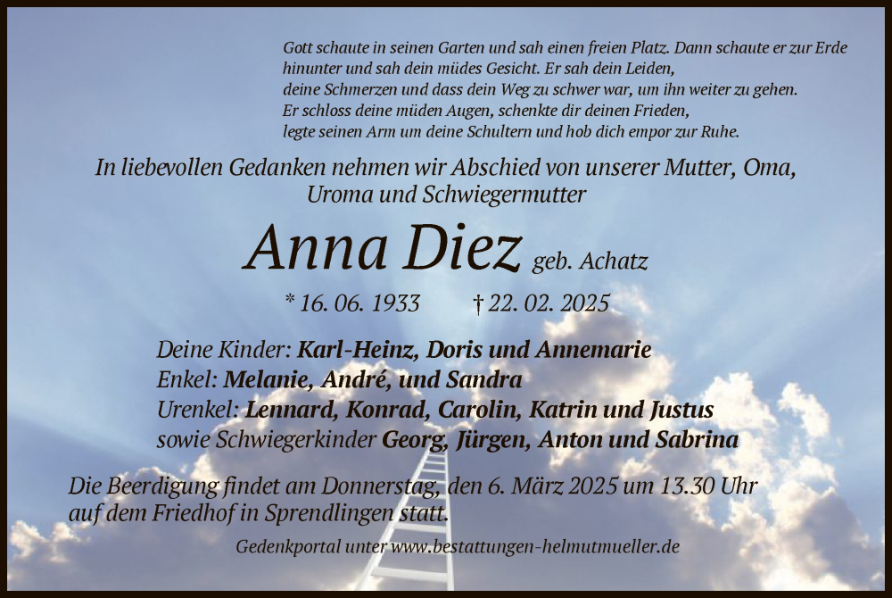 Hier finden Sie alle Traueranzeigen aus der Zeitung, die bisher für Anna Diez erschienen sind. Weitere Traueranzeigen, die in der Zeitung erscheinen, werden hier ebenfalls aufgelistet