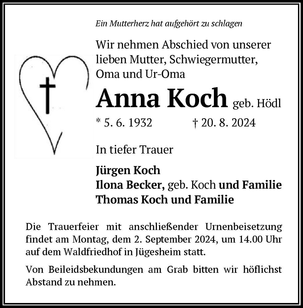 Hier finden Sie alle Traueranzeigen aus der Zeitung, die bisher für Anna Koch erschienen sind. Weitere Traueranzeigen, die in der Zeitung erscheinen, werden hier ebenfalls aufgelistet