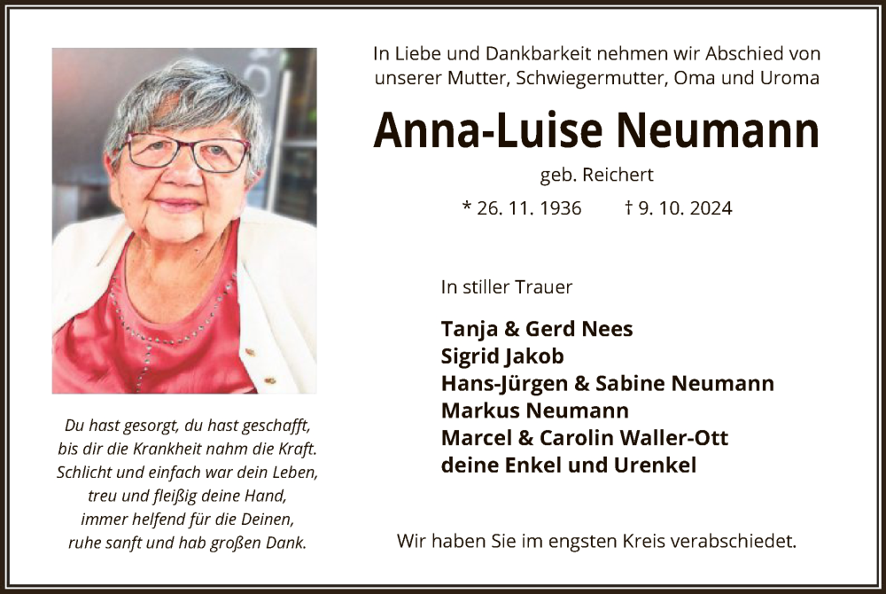 Hier finden Sie alle Traueranzeigen aus der Zeitung, die bisher für Anna-Luise Neumann erschienen sind. Weitere Traueranzeigen, die in der Zeitung erscheinen, werden hier ebenfalls aufgelistet