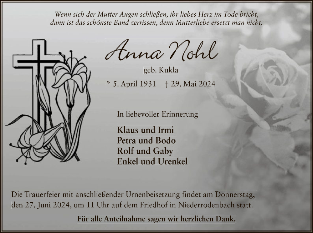 Hier finden Sie alle Traueranzeigen aus der Zeitung, die bisher für Anna Nohl erschienen sind. Weitere Traueranzeigen, die in der Zeitung erscheinen, werden hier ebenfalls aufgelistet