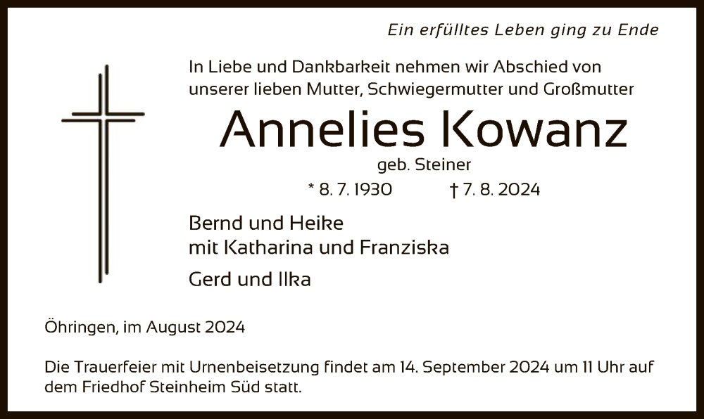 Hier finden Sie alle Traueranzeigen aus der Zeitung, die bisher für Annelies Kowanz erschienen sind. Weitere Traueranzeigen, die in der Zeitung erscheinen, werden hier ebenfalls aufgelistet