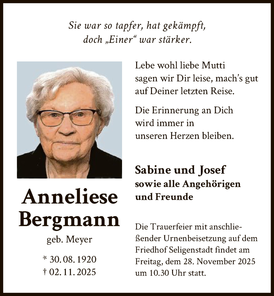 Hier finden Sie alle Traueranzeigen aus der Zeitung, die bisher für Anneliese Bergmann erschienen sind. Weitere Traueranzeigen, die in der Zeitung erscheinen, werden hier ebenfalls aufgelistet