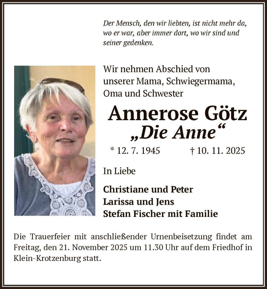 Hier finden Sie alle Traueranzeigen aus der Zeitung, die bisher für Annerose Götz erschienen sind. Weitere Traueranzeigen, die in der Zeitung erscheinen, werden hier ebenfalls aufgelistet