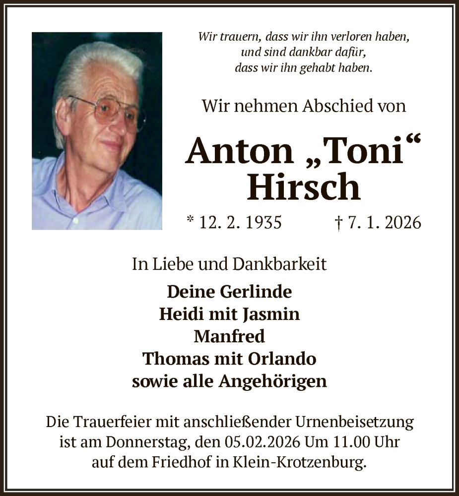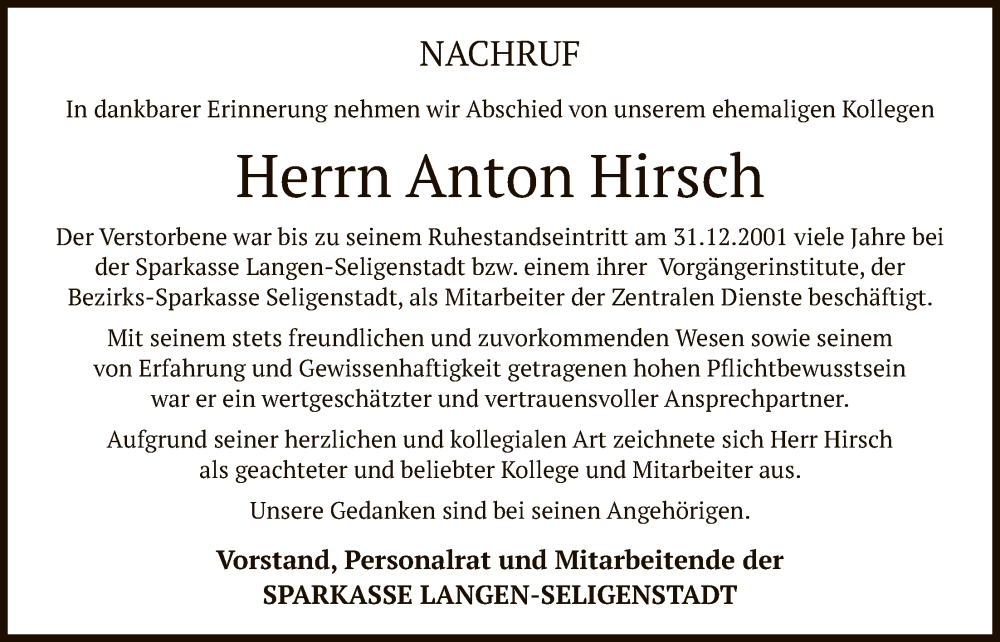 Hier finden Sie alle Traueranzeigen aus der Zeitung, die bisher für Anton Hirsch erschienen sind. Weitere Traueranzeigen, die in der Zeitung erscheinen, werden hier ebenfalls aufgelistet