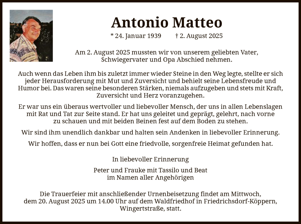 Hier finden Sie alle Traueranzeigen aus der Zeitung, die bisher für Antonio Matteo erschienen sind. Weitere Traueranzeigen, die in der Zeitung erscheinen, werden hier ebenfalls aufgelistet