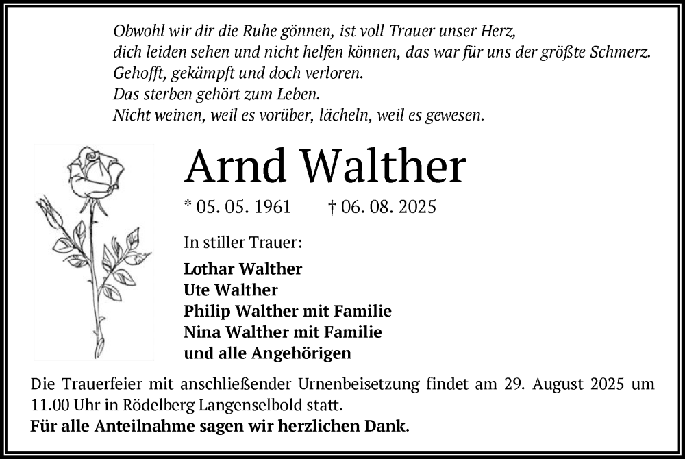 Hier finden Sie alle Traueranzeigen aus der Zeitung, die bisher für Arnd Walther erschienen sind. Weitere Traueranzeigen, die in der Zeitung erscheinen, werden hier ebenfalls aufgelistet
