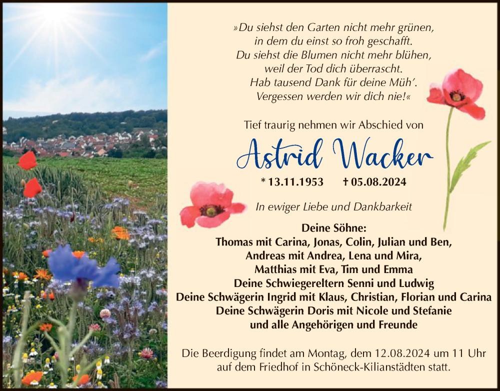 Hier finden Sie alle Traueranzeigen aus der Zeitung, die bisher für Astrid Wacker erschienen sind. Weitere Traueranzeigen, die in der Zeitung erscheinen, werden hier ebenfalls aufgelistet