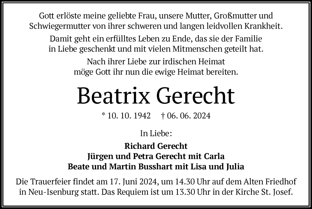 Hier finden Sie alle Traueranzeigen aus der Zeitung, die bisher für Beatrix Gerecht erschienen sind. Weitere Traueranzeigen, die in der Zeitung erscheinen, werden hier ebenfalls aufgelistet