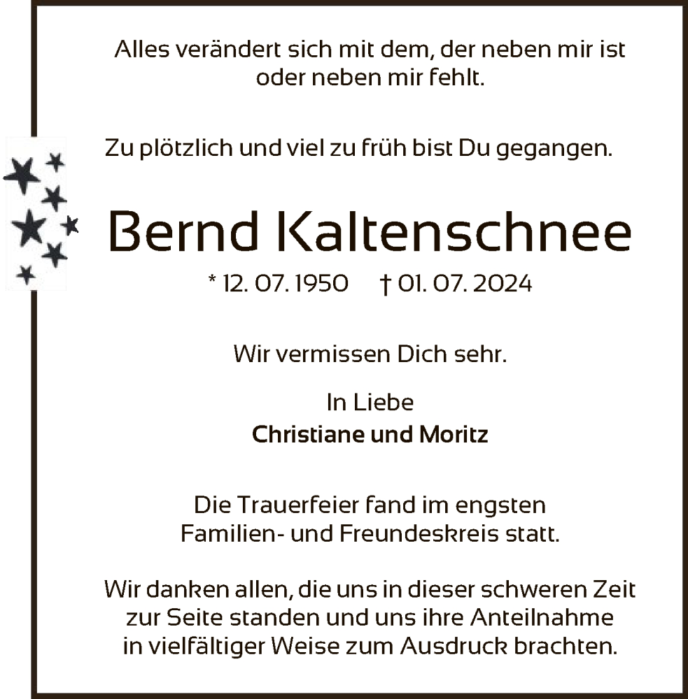 Hier finden Sie alle Traueranzeigen aus der Zeitung, die bisher für Bernd Kaltenschnee erschienen sind. Weitere Traueranzeigen, die in der Zeitung erscheinen, werden hier ebenfalls aufgelistet