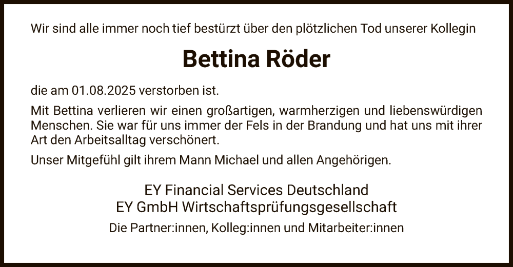 Hier finden Sie alle Traueranzeigen aus der Zeitung, die bisher für Bettina Röder erschienen sind. Weitere Traueranzeigen, die in der Zeitung erscheinen, werden hier ebenfalls aufgelistet