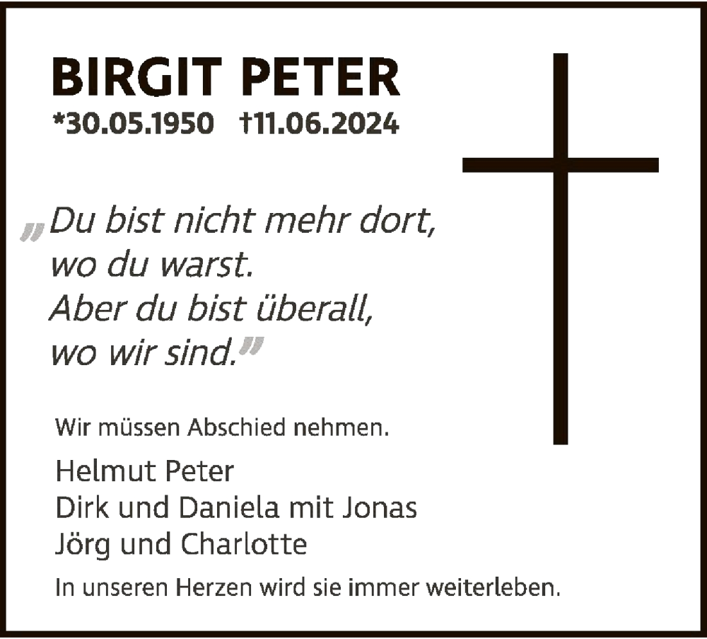 Hier finden Sie alle Traueranzeigen aus der Zeitung, die bisher für Birgit Peter erschienen sind. Weitere Traueranzeigen, die in der Zeitung erscheinen, werden hier ebenfalls aufgelistet