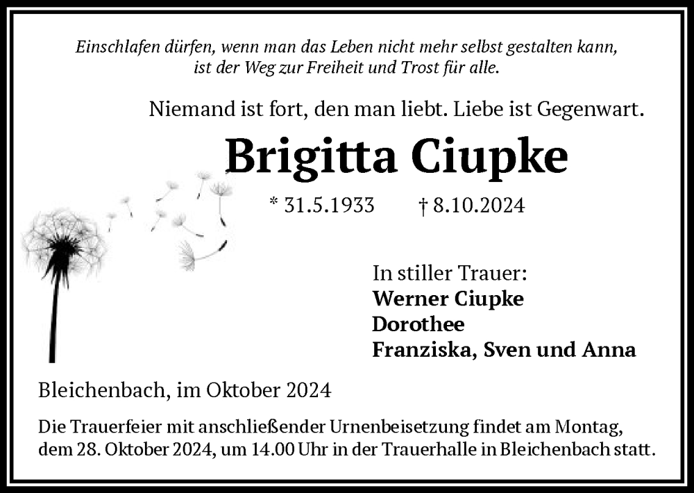 Hier finden Sie alle Traueranzeigen aus der Zeitung, die bisher für Brigitta Ciupke erschienen sind. Weitere Traueranzeigen, die in der Zeitung erscheinen, werden hier ebenfalls aufgelistet