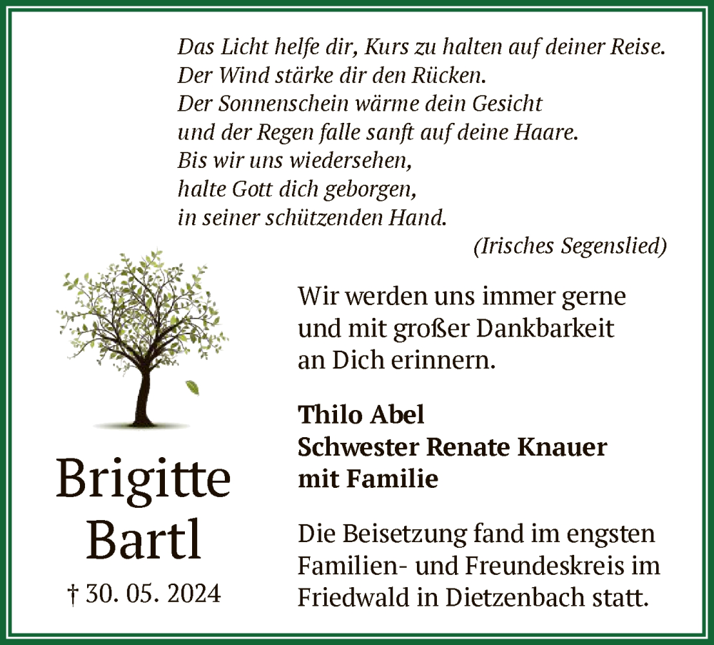 Hier finden Sie alle Traueranzeigen aus der Zeitung, die bisher für Brigitte Bartl erschienen sind. Weitere Traueranzeigen, die in der Zeitung erscheinen, werden hier ebenfalls aufgelistet