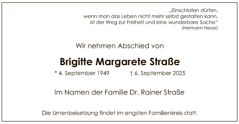 Hier finden Sie alle Traueranzeigen aus der Zeitung, die bisher für Brigitte Margarete Straße erschienen sind. Weitere Traueranzeigen, die in der Zeitung erscheinen, werden hier ebenfalls aufgelistet