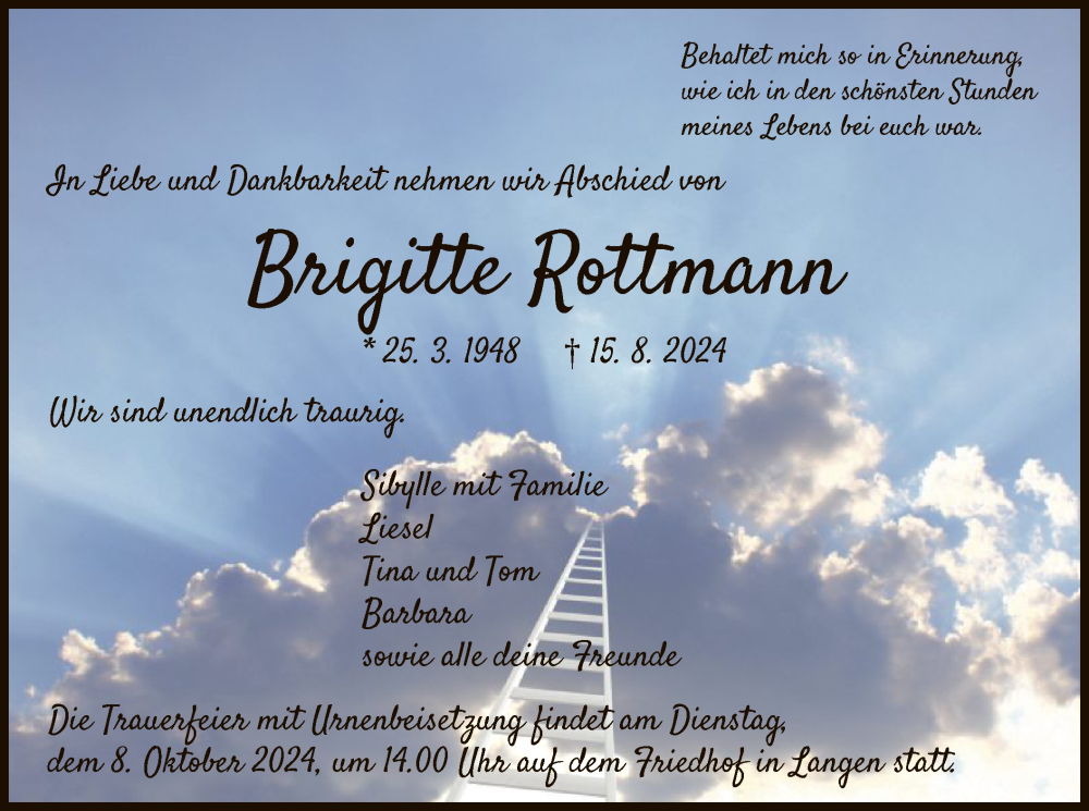 Hier finden Sie alle Traueranzeigen aus der Zeitung, die bisher für Brigitte Rottmann erschienen sind. Weitere Traueranzeigen, die in der Zeitung erscheinen, werden hier ebenfalls aufgelistet