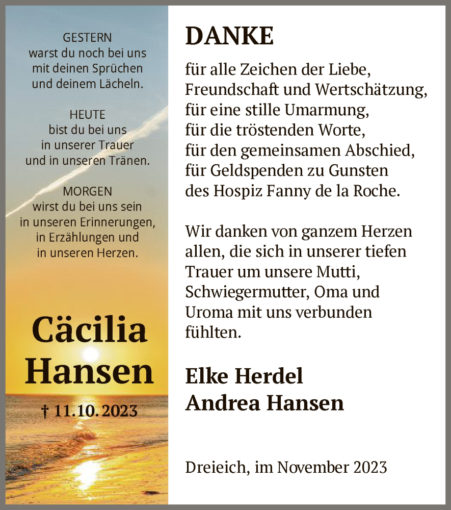 Hier finden Sie alle Traueranzeigen aus der Zeitung, die bisher für Cäcilia Hansen erschienen sind. Weitere Traueranzeigen, die in der Zeitung erscheinen, werden hier ebenfalls aufgelistet