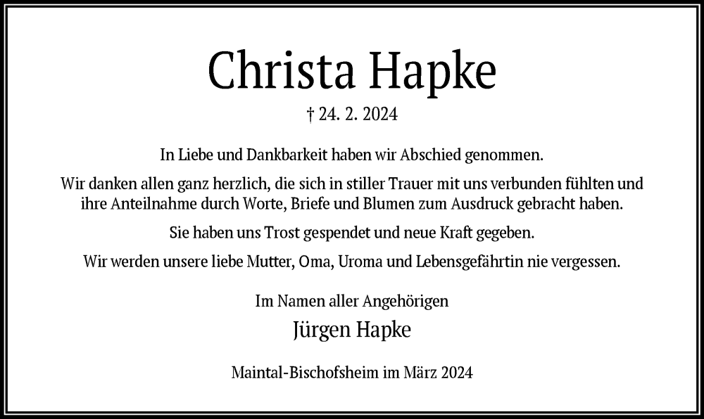 Hier finden Sie alle Traueranzeigen aus der Zeitung, die bisher für Christa Hapke erschienen sind. Weitere Traueranzeigen, die in der Zeitung erscheinen, werden hier ebenfalls aufgelistet