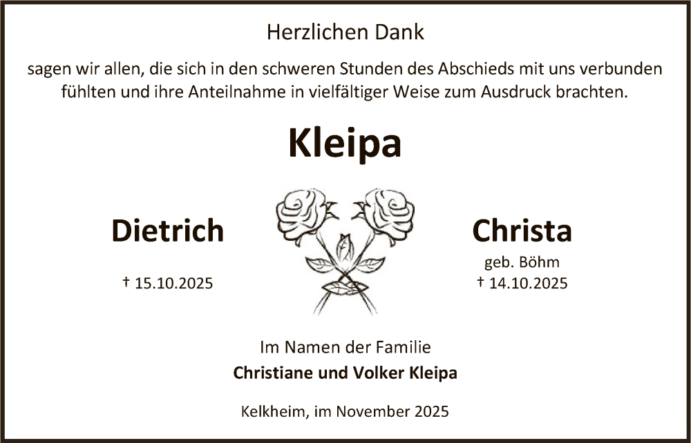 Hier finden Sie alle Traueranzeigen aus der Zeitung, die bisher für Christa Kleipa erschienen sind. Weitere Traueranzeigen, die in der Zeitung erscheinen, werden hier ebenfalls aufgelistet