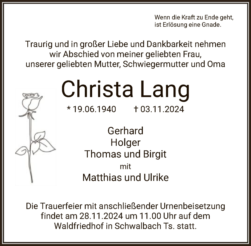 Hier finden Sie alle Traueranzeigen aus der Zeitung, die bisher für Christa Lang erschienen sind. Weitere Traueranzeigen, die in der Zeitung erscheinen, werden hier ebenfalls aufgelistet