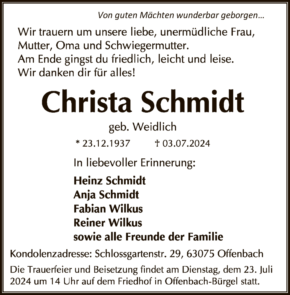 Hier finden Sie alle Traueranzeigen aus der Zeitung, die bisher für Christa Schmidt erschienen sind. Weitere Traueranzeigen, die in der Zeitung erscheinen, werden hier ebenfalls aufgelistet