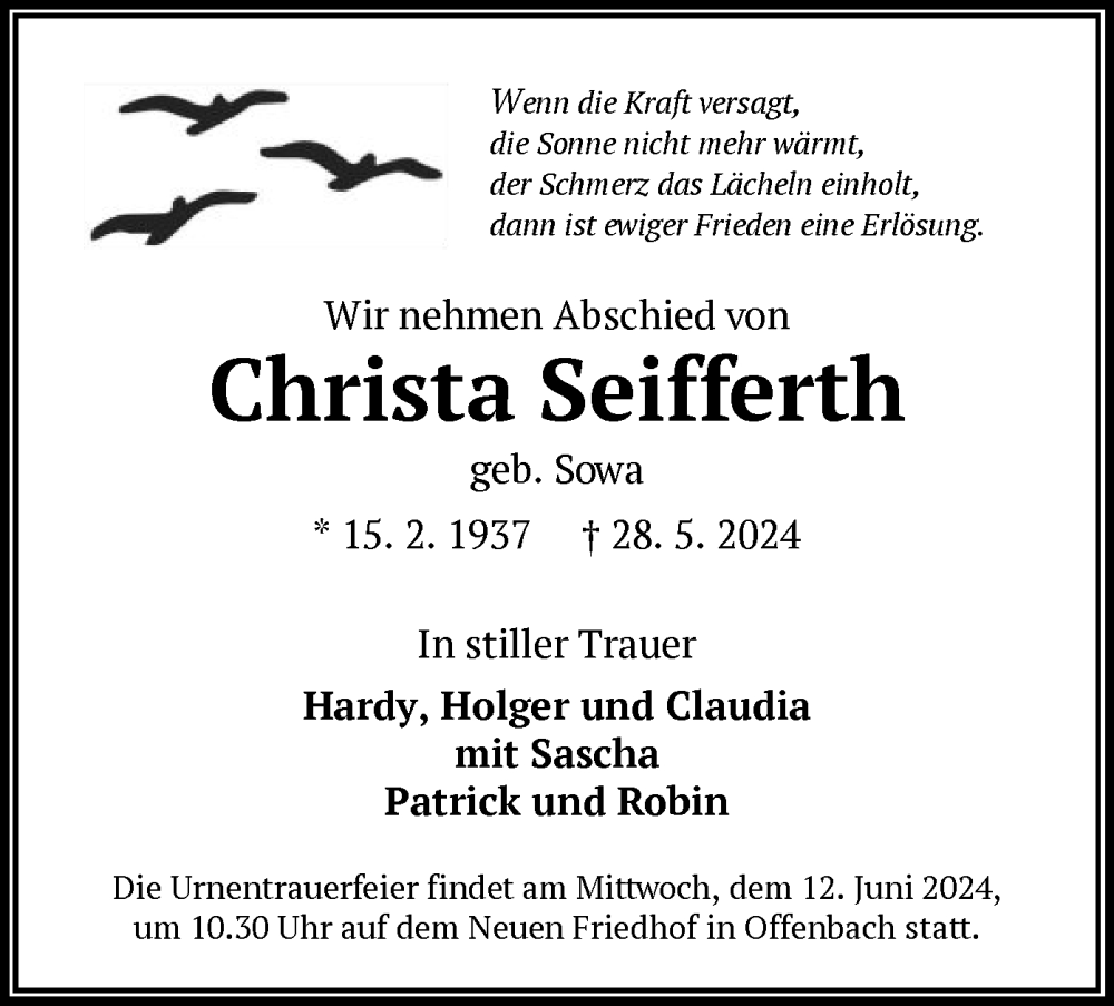 Hier finden Sie alle Traueranzeigen aus der Zeitung, die bisher für Christa Seifferth erschienen sind. Weitere Traueranzeigen, die in der Zeitung erscheinen, werden hier ebenfalls aufgelistet