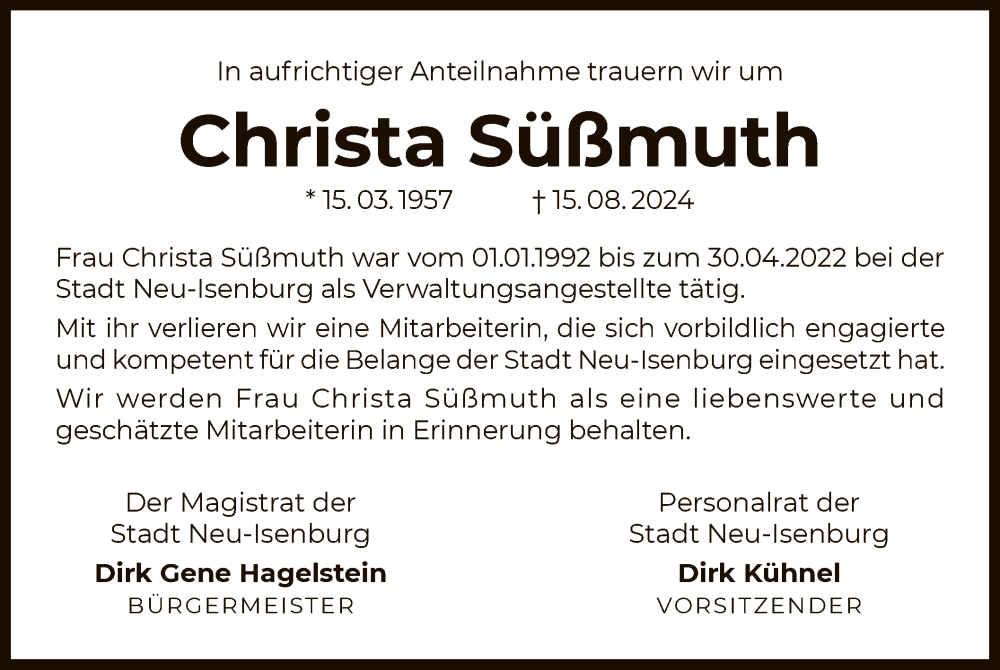 Hier finden Sie alle Traueranzeigen aus der Zeitung, die bisher für Christa Süßmuth erschienen sind. Weitere Traueranzeigen, die in der Zeitung erscheinen, werden hier ebenfalls aufgelistet