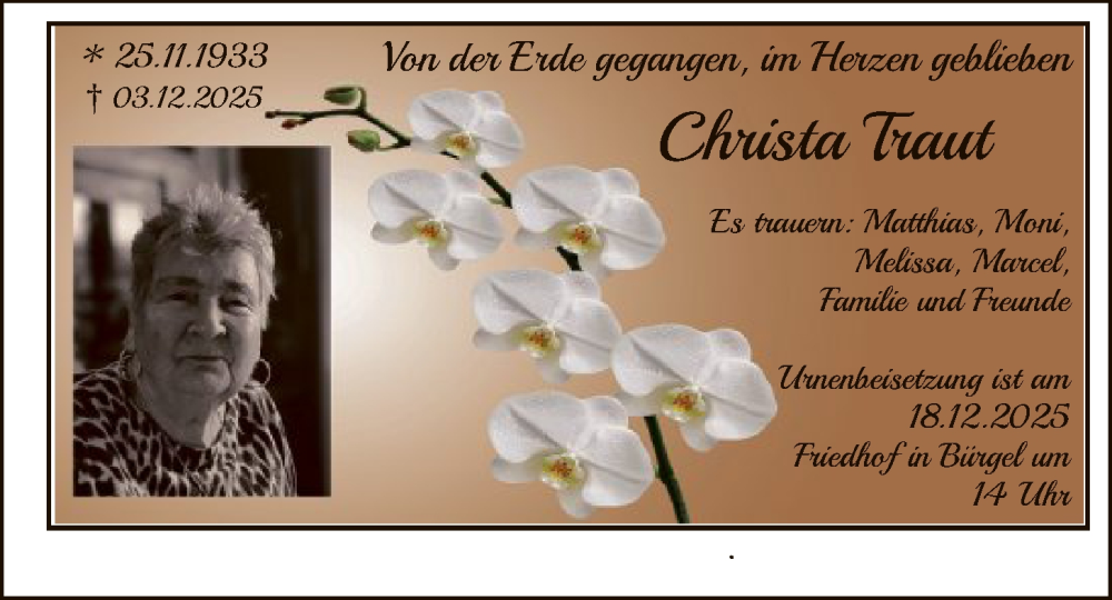 Hier finden Sie alle Traueranzeigen aus der Zeitung, die bisher für Christa Traut erschienen sind. Weitere Traueranzeigen, die in der Zeitung erscheinen, werden hier ebenfalls aufgelistet