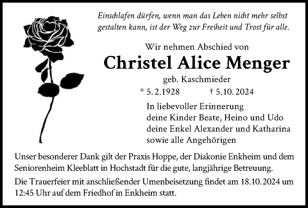 Hier finden Sie alle Traueranzeigen aus der Zeitung, die bisher für Christel Alice Menger erschienen sind. Weitere Traueranzeigen, die in der Zeitung erscheinen, werden hier ebenfalls aufgelistet