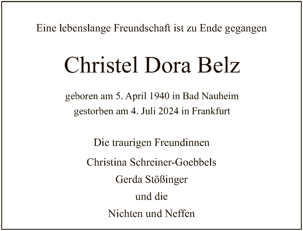 Hier finden Sie alle Traueranzeigen aus der Zeitung, die bisher für Christel Dora Belz erschienen sind. Weitere Traueranzeigen, die in der Zeitung erscheinen, werden hier ebenfalls aufgelistet
