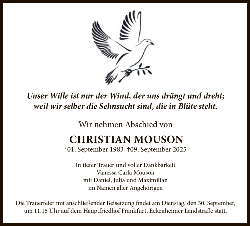 Hier finden Sie alle Traueranzeigen aus der Zeitung, die bisher für Christian Mouson erschienen sind. Weitere Traueranzeigen, die in der Zeitung erscheinen, werden hier ebenfalls aufgelistet