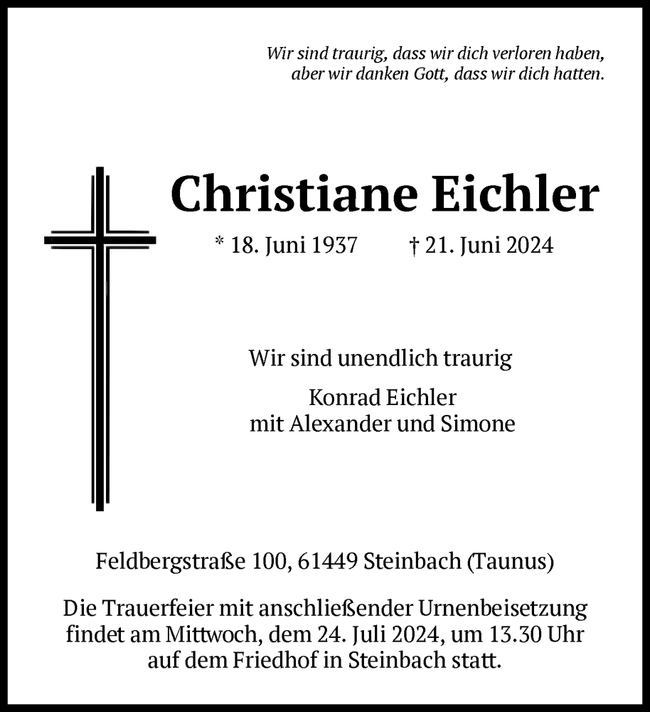 Hier finden Sie alle Traueranzeigen aus der Zeitung, die bisher für Christiane Eichler erschienen sind. Weitere Traueranzeigen, die in der Zeitung erscheinen, werden hier ebenfalls aufgelistet
