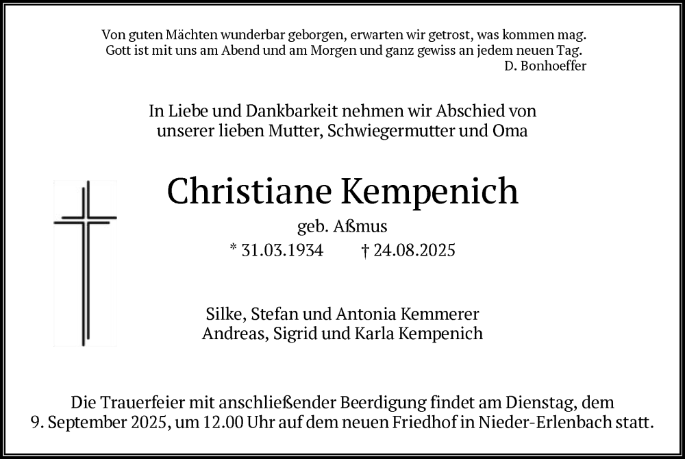 Hier finden Sie alle Traueranzeigen aus der Zeitung, die bisher für Christiane Kempenich erschienen sind. Weitere Traueranzeigen, die in der Zeitung erscheinen, werden hier ebenfalls aufgelistet