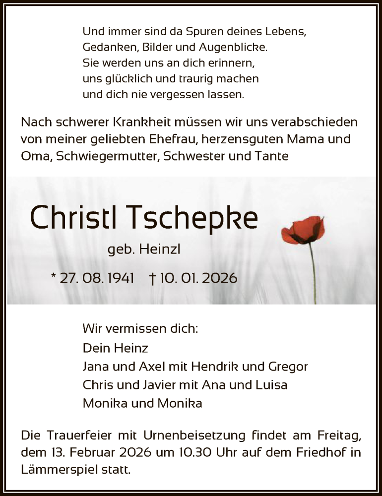 Hier finden Sie alle Traueranzeigen aus der Zeitung, die bisher für Christl Tschepke erschienen sind. Weitere Traueranzeigen, die in der Zeitung erscheinen, werden hier ebenfalls aufgelistet