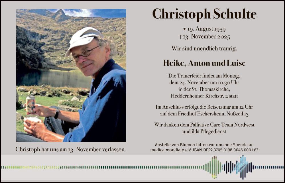 Hier finden Sie alle Traueranzeigen aus der Zeitung, die bisher für Christoph Schulte erschienen sind. Weitere Traueranzeigen, die in der Zeitung erscheinen, werden hier ebenfalls aufgelistet