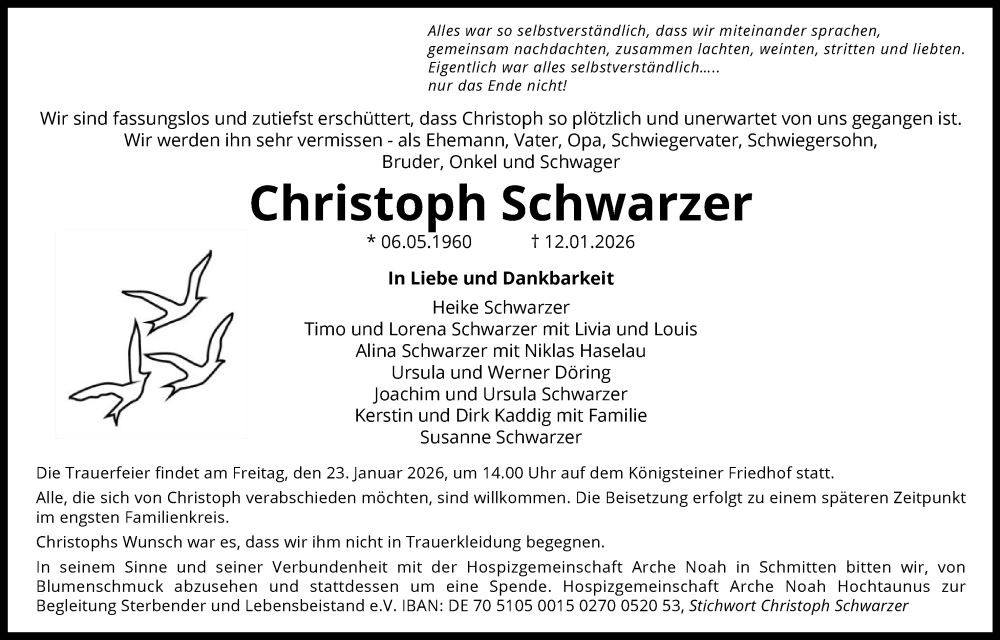 Hier finden Sie alle Traueranzeigen aus der Zeitung, die bisher für Christoph Schwarzer erschienen sind. Weitere Traueranzeigen, die in der Zeitung erscheinen, werden hier ebenfalls aufgelistet