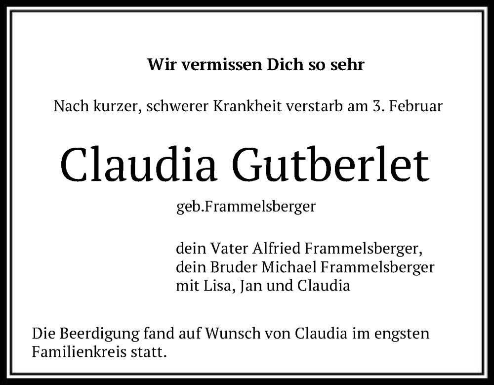 Hier finden Sie alle Traueranzeigen aus der Zeitung, die bisher für Claudia Gutberlet erschienen sind. Weitere Traueranzeigen, die in der Zeitung erscheinen, werden hier ebenfalls aufgelistet