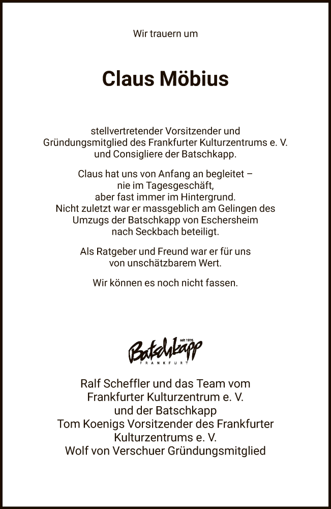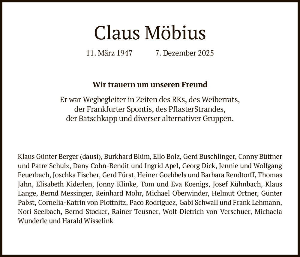 Hier finden Sie alle Traueranzeigen aus der Zeitung, die bisher für Claus Möbius erschienen sind. Weitere Traueranzeigen, die in der Zeitung erscheinen, werden hier ebenfalls aufgelistet
