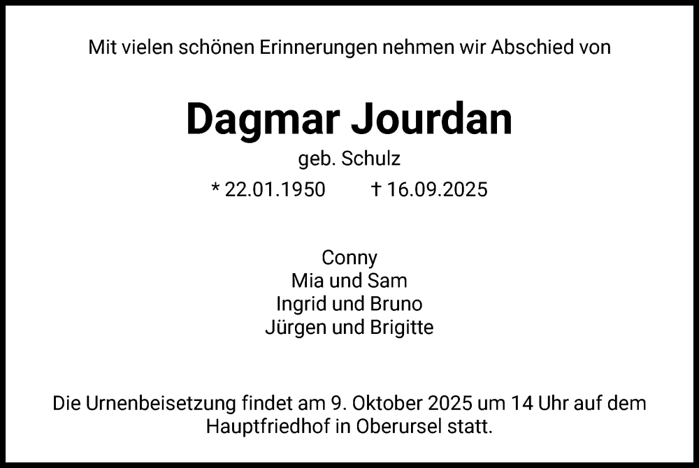 Hier finden Sie alle Traueranzeigen aus der Zeitung, die bisher für Dagmar Jourdan erschienen sind. Weitere Traueranzeigen, die in der Zeitung erscheinen, werden hier ebenfalls aufgelistet